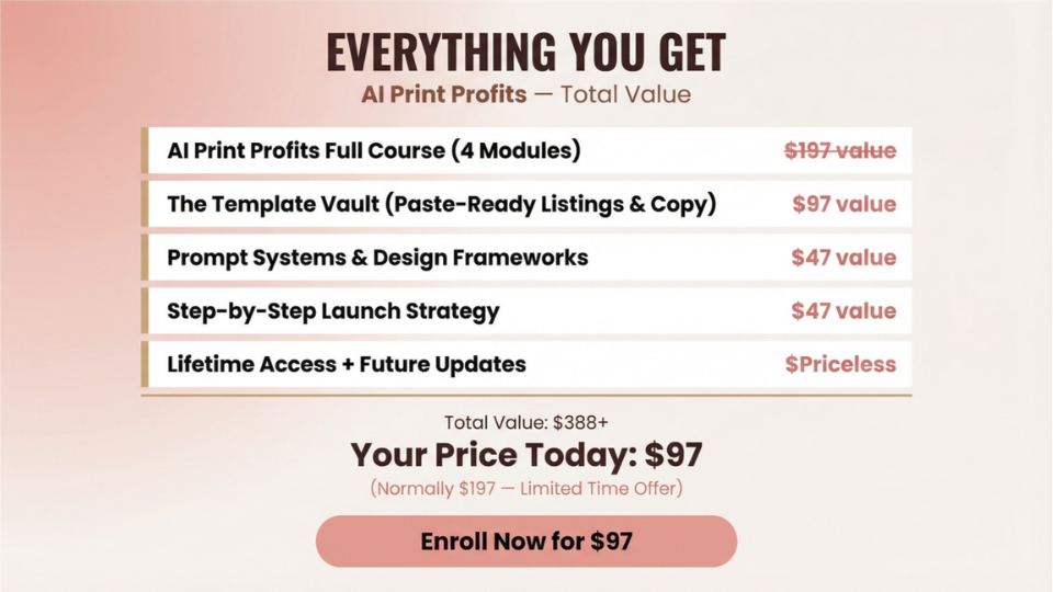 AI Print Profits is a no-fluff training that gives you the exact process to create and sell digital products with AI, without the chaos. • ✅ What to Create: Uncover the digital products that are actually in demand and sell consistently. No more guessing what customers want. • ✅ How to Generate & Design: Master AI prompting to get the exact style you want, every time. We'll show you how to create cohesive collections, not just random one-off images. • ✅ How to Package It: Learn to turn your AI art into professional, ready-to-sell assets. We're talking templates, product bundles, and complete prompt systems that customers love. • ✅ How to List & Launch: Get a simple, repeatable strategy to get your products listed and in front of buyers on platforms like Etsy, without the overwhelm.