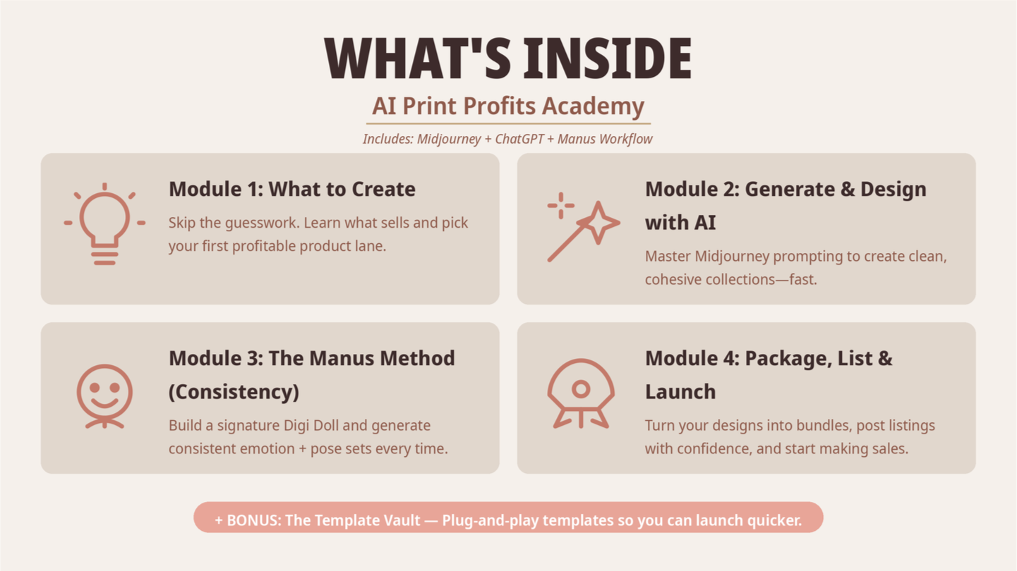 AI Print Profits Academy teaches beginners how to use Midjourney + ChatGPT + Manus to create consistent characters, build digital product bundles, and launch on a sales marketplace platform you choose. “Includes: Midjourney + ChatGPT + Manus Workflow”™